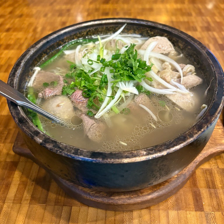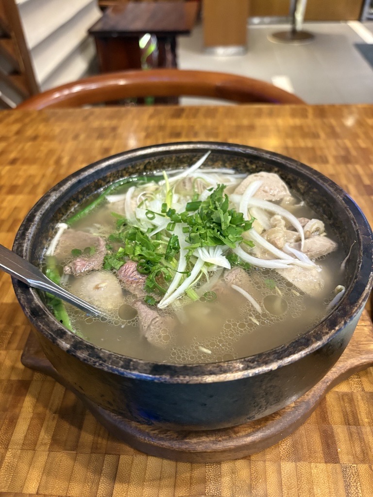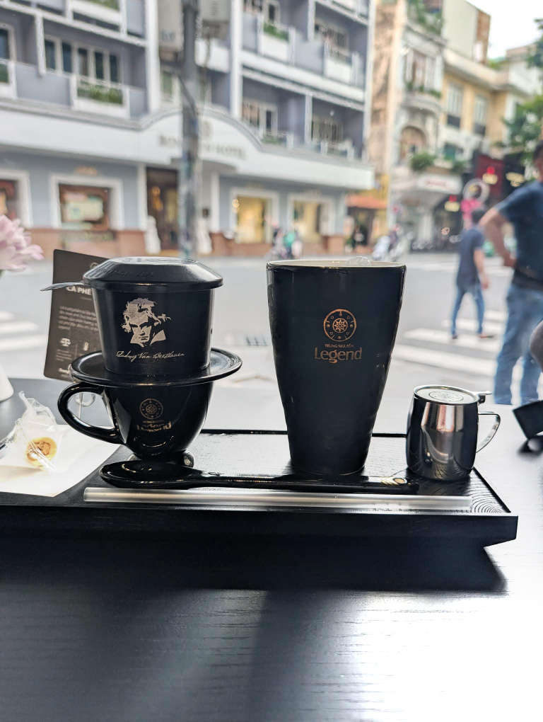 写真は伝統的なベトナムコーヒーの抽出器具「phin(フィン)」で淹れたコーヒー。金属製フィルターでゆっくりと一滴ずつ抽出される様子を眺めながら待つ時間も含めて、ベトナムコーヒー文化の醍醐味です。濃厚で力強い味わいが特徴で、学会の疲れを癒すのにぴったりでした。ホットやブラックで飲むこともできますが、氷や練乳と混ぜてアイスミルクコーヒーとして飲むのが、チュングエンレジェンドのおすすめ。カップに印刷されているのは作曲家ベートーヴェン。彼が毎朝正確に60粒の豆を数えてコーヒーを淹れていた逸話から、このカフェでは創造性とコーヒーの象徴として偉人たちが描かれています。