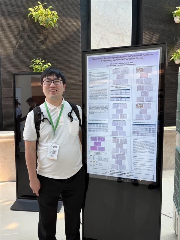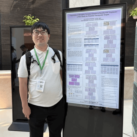 当院からは2題のポスター演題が採択され、耳鼻咽喉科学講座 松山浩太先生が副甲状腺腫瘍における受容体型チロシンキナーゼ(RTK)発現の検討を、医学部非常勤講師 佐々木徹先生が未分化甲状腺癌の臨床経過とRTKシグナル解析を発表しました。どちらの研究も基礎と臨床を橋渡しする内容で、海外研究者から積極的な質問が寄せられ、国際的に関心が高い領域であることを実感しました。