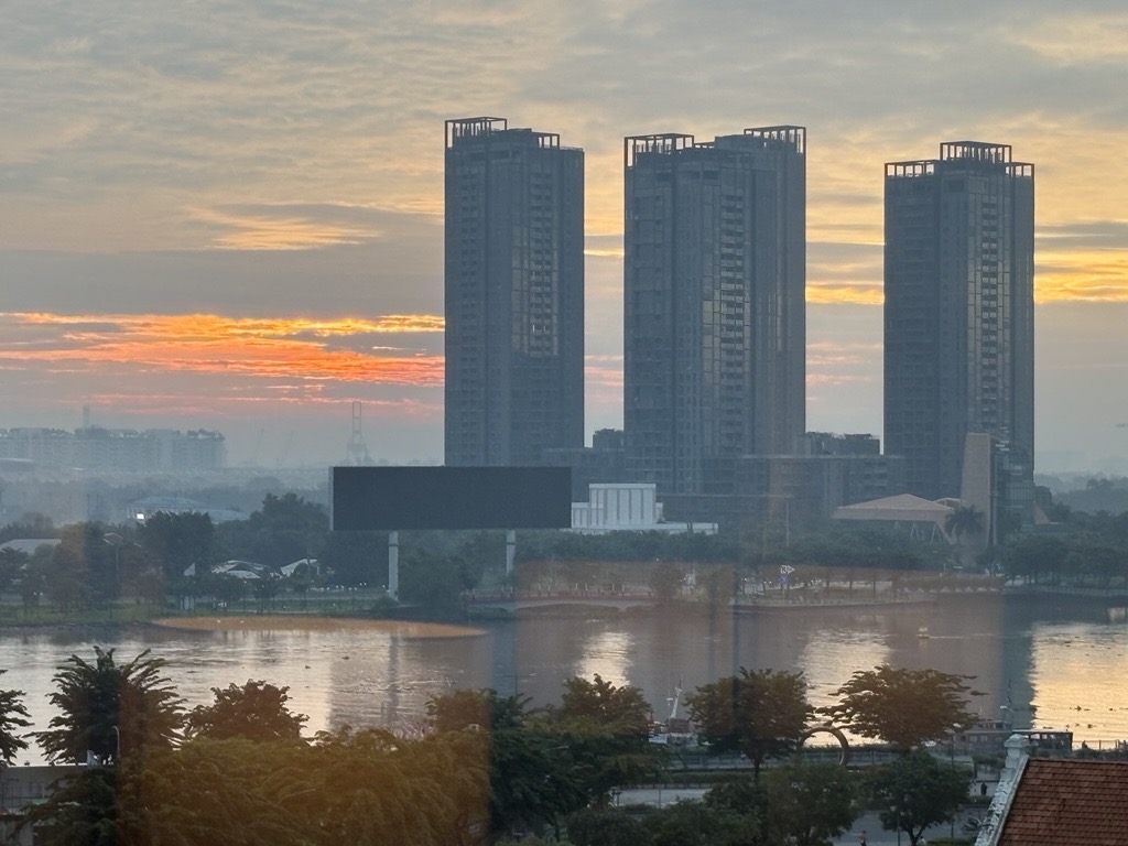 ホテルの窓から見下ろしたサイゴン川は、朝日が昇るにつれて水面がやわらかく染まり、高層ビル群がゆっくりと黄金色に浮かび上がる幻想的な景色に。都会的な風景の中にも穏やかさがあり、1日の始まりに心がすっと静かになる時間でした。