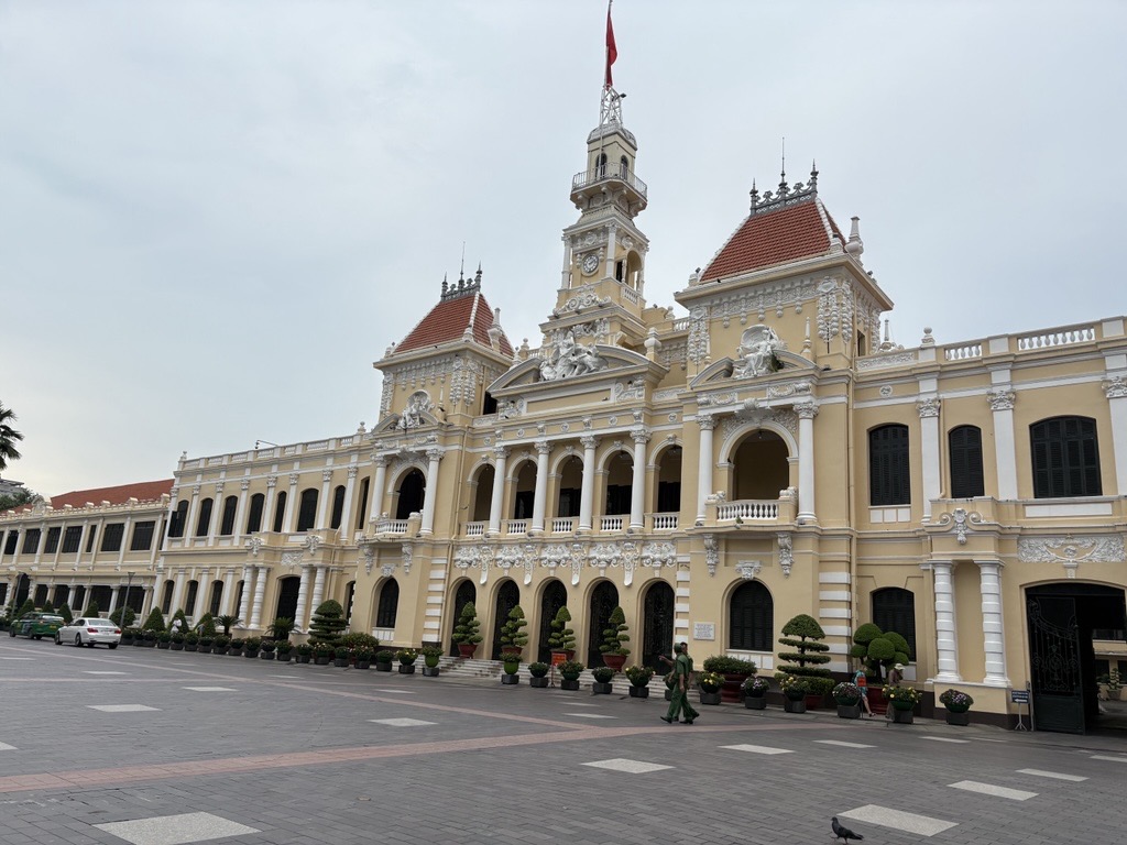フランス植民地時代に建てられた建築物で、ホーチミンを代表するランドマークのひとつ。白い外壁と赤い屋根、繊細な装飾が美しく、まるで絵葉書のような景観です。朝の澄んだ光の中で見る庁舎は特に印象的で、思わずシャッターを切りたくなる場所でした。
